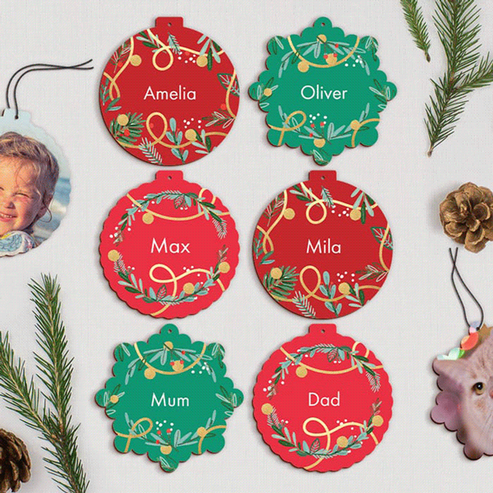 Christmas decorating just got personal with double sided personalized Christmas tree decorations. Choose from festive designs & shapes then customize with a short message, a photo or both!