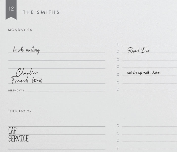 - The traditional weekly diary view. Days of the week are split between the page spread. Each day contains space for general notes, a checklist column and a dedicated birthday field.